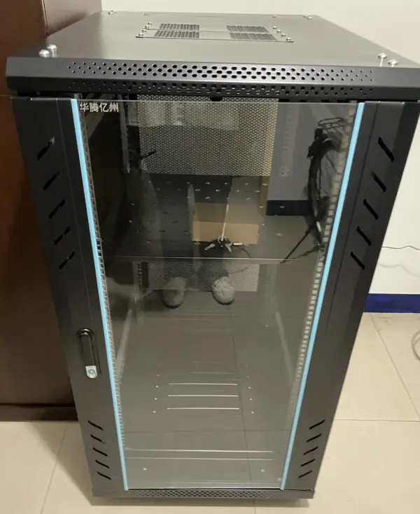 規格:高度 120 公分/22U/寬 600 公分/深 800 公分這台機櫃上方出風口可以裝 4 顆風扇,原先有附兩顆 220V 的散熱風扇,但我家是 110V 的電,於是沒想太多,又去光華商場花了 1260 買了 4 顆「高風量」風扇,只能說比早餐店抽油煙機還吵啊,幸好我是把機櫃放車庫,就將就著用吧。