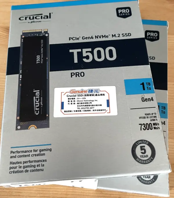| NVMe M.2 SSD(系統碟使用) | Micron Crucial T500 1TB | 5000x1 | 2588 | 2 |